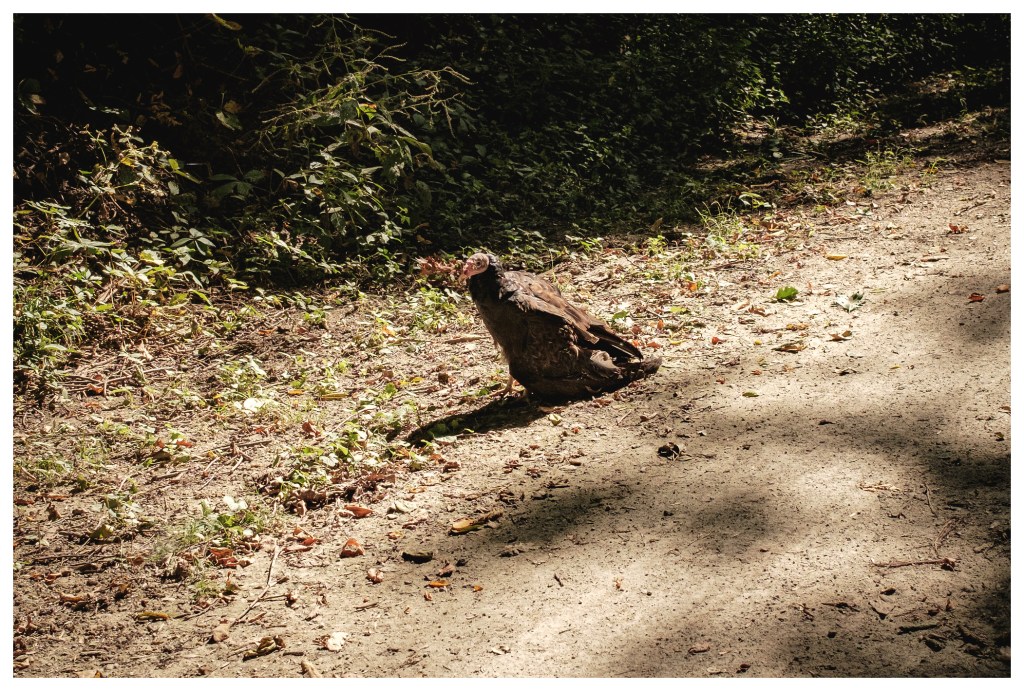 Ahead of us on the trail was a black lump, clearly some sort of animal, but what it was exactly was unclear. As we biked closer we could see it was a turkey vulture. Turkey vultures are not what one calls beautiful at all, or majestic, or anything like that. They are bald and grandpa-like in their features.