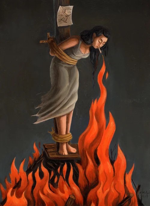 There are some of the girls that notice the elemental changes in themselves and react with an astounding rage. They confuse love with witchcraft. So instead picking flowers, they gather sticks in bundles. They lay them at Sarah’s feet. They tie her up with their hisses and accusations. They call her names, and slander her own. They light a match and set her aflame.