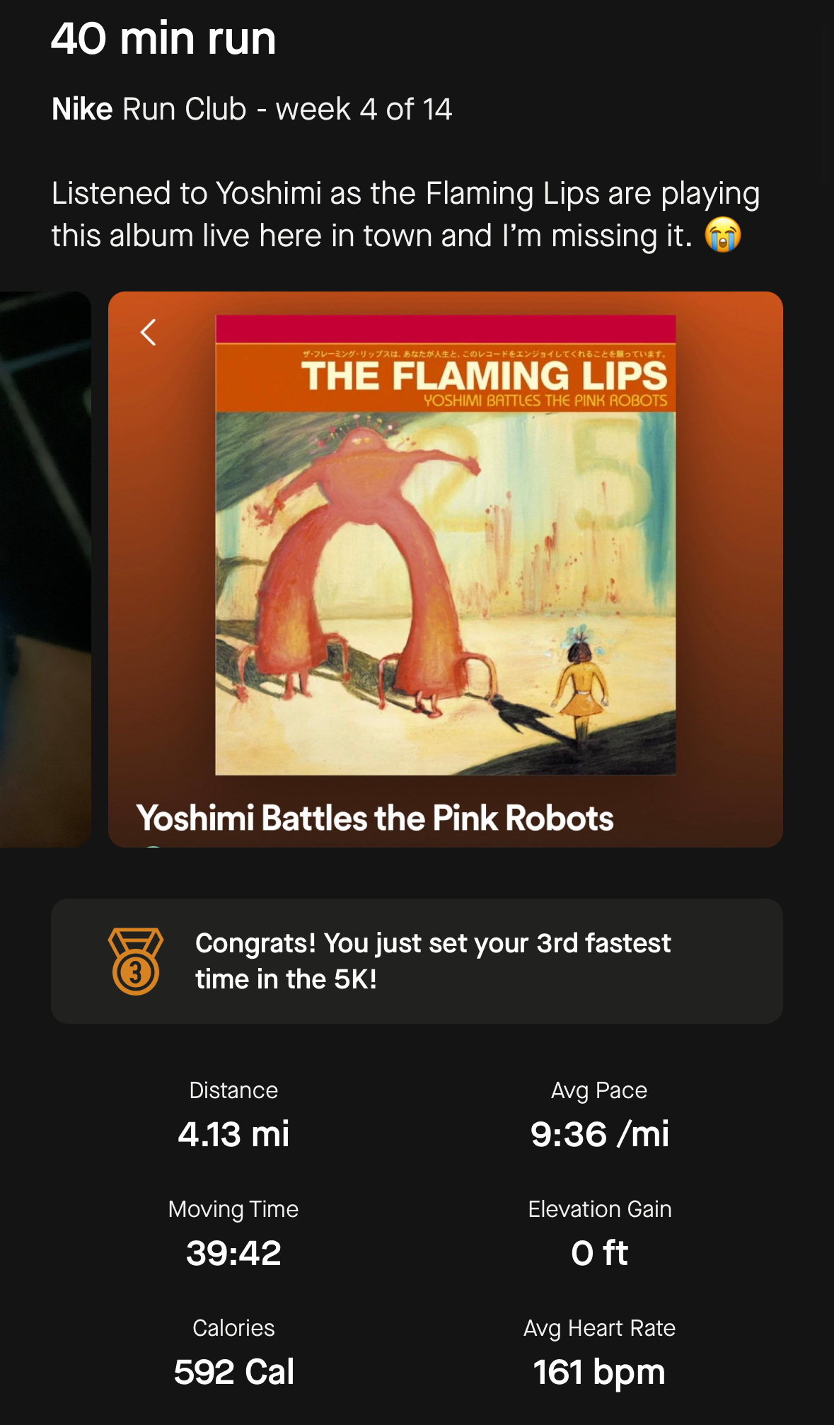 He sent me a couple photos and videos from the show with huge inflatable pink robots and confetti and giant inflated balloons bouncing around the venue. As I ran around the track that night, the lyrics hit deeper and traveled to more places than they did for me back when I was in high school. It had been twenty-one years since I purchased that album from that CD shop. A lot of life happens in that time.