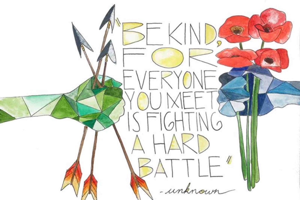 It was in that class that he first shared the quote and maxim, “Be kind, for everyone you meet is fighting a great/hard battle.” The explanation of that concept reoriented my perspective towards grace and mercy towards others, and it helped me see people more fully and with more patience. Soon after that class, I had a piece of art commissioned using that quote and it now hangs on our living room wall where every one of our kids sees it every day.